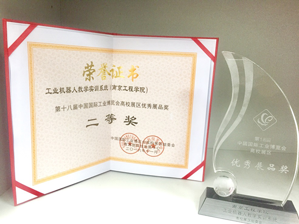 在展品评比中,我公司与南京工程学院联合开发的“工业机器人教学实训系统”获教育部科技发展中心颁发的“高校展区优秀展品二等奖”。