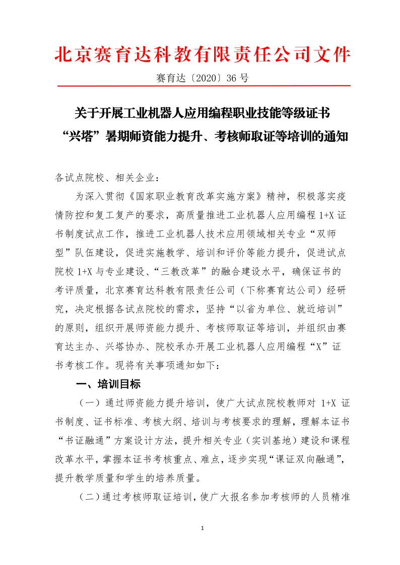 关于开展工业机器人应用编程职业技能等级证书“兴塔”暑期师资能力提升、考核师取证培训的通知