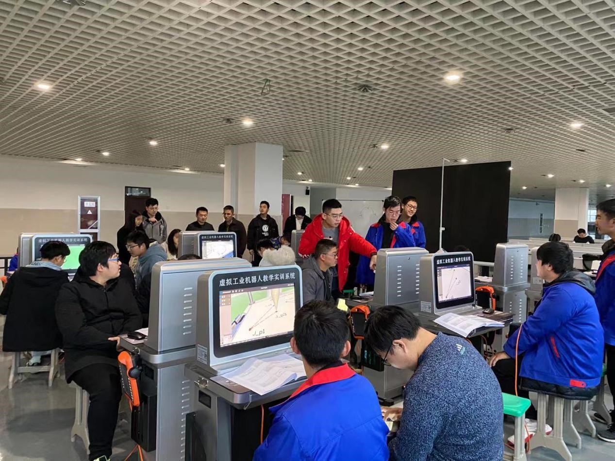 此次工业机器人专项能力培训班历时十天,共进行了两天的理论讲解、八天的实操培训。本次培训采用了南京旭上数控技术有限公司的虚拟工业机器人教学实训系统,采用了虚实结合的培训模式,应用了涂胶、搬运、码垛等多个工业应用场景。虚拟工业机器人实训系统能够做到的好教、好学、好培、好考;以达到经济、安全、高效的目的。